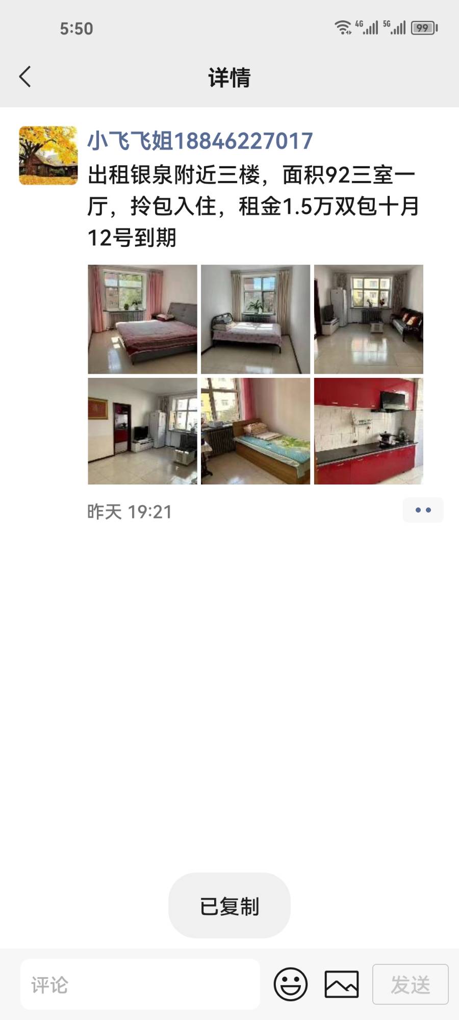 出租银泉附近三楼,面积92三室一厅,拎包入住,租金1.5万双包十月12号到期